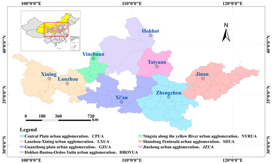 The YRB constitutes a key area characterized by high population density and substantial economic activity in China [36], comprising seven major urban agglomerations (Figure 1). These urban agglomerations encompass sixty-nine prefecture-level cities (Appendix A, Table A1) and form the forefront of promoting ecological sustainability and regional development in the YRB. By 2022, the seven urban agglomerations in the YRB were home to approximately 270 million people, comprising around 64% of the basin’s total population. These regions collectively contributed nearly 70% of the YRB’s total GDP.