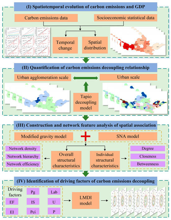 Global concern regarding climate change and carbon emissions has intensified in recent years. Accelerated industrial and urban development has led to a substantial increase in carbon emissions, which has had a significant effect on the global climate [1]. The United Nations has promoted global cooperation on emission reduction through international frameworks such as the Paris Agreement, while the IPCC has continuously called for urgent action based on scientific assessments [2]. The international community has widely recognized the urgency of controlling carbon emissions and addressing climate change [3]. China, being the most populous nation and the second-largest economy, ranked first globally in carbon emissions in 2019 [4]. In September 2020, the Chinese government officially announced its commitment to the international community to accomplish the “dual carbon” objectives [5]. Pursuing a low-carbon transition and meeting carbon reduction targets poses a major challenge to China’s pursuit of sustainable development [6]. Urban agglomerations, as advanced regional spatial forms emerging in the process of industrialization and urbanization, play a central role in tackling climate change and advancing the low-carbon transition. They are characterized by a high concentration of economic activity and population [7]. As of 2021, China’s 19 urban agglomerations, occupying 25% of the land area, concentrated 75% of the total population and generated 80% of the national GDP, but they also caused ecological degradation and substantial carbon emissions [8]. Therefore, uncovering the linkage between economic progress and carbon emissions decoupling, spatial association characteristics, and driving factors at the urban agglomeration scale is crucial for achieving the “dual carbon” goals.