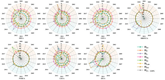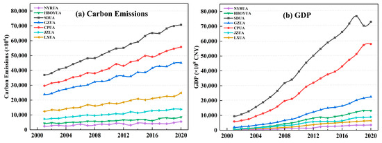 To provide a comprehensive characterization of the carbon emissions and GDP dynamics across the seven urban agglomerations, Table 2 presents the variation rates across different periods. The results indicate that the carbon emission growth rates in the LXUA, NYRUA, and HBOYUA exhibited a downward trend followed by an upward shift over time. In contrast, the carbon emission growth rates in the JZUA, GZUA, CPUA, and SDUA exhibited a fluctuating downward trend. Compared to the period from 2001 to 2005, the carbon emission growth rate of the JZUA experienced the largest reduction during 2016–2020, with a decrease of 64.92%. Meanwhile, the GDP growth rates of seven urban agglomerations exhibited a declining trend. The SDUA underwent the most significant decline in GDP growth rate, decreasing from 98.84% (2001–2005) to 10.48% (2016–2020), representing a reduction of 89.39%.