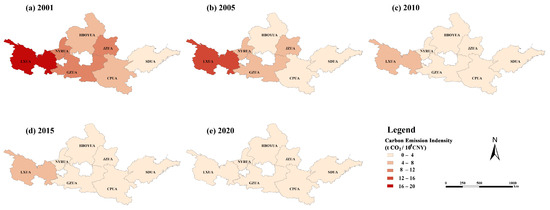 Figure 5 presents the spatiotemporal evolution of carbon emission intensity across YRB urban agglomerations. Spatially, urban agglomerations in the eastern YRB generally exhibit lower carbon emission intensity than those in the west. In five typical years, the SDUA exhibits a carbon emission intensity of less than 4 t/CNY 10,000. Temporally, carbon emission intensity has exhibited a downward trend over the years. By 2020, all urban agglomerations in the YRB had achieved carbon emission intensities lower than 4 t/CNY 10,000, indicating steady progress in energy efficiency and emission reduction, along with a clear move toward low-carbon development. This lays a firm basis for the pursuit of the dual carbon objectives in the YRB. The LXUA experienced the largest reduction in carbon emission intensity, decreasing from 17.70 t/CNY 10,000 in 2001 to 3.87 t/CNY 10,000 in 2020, representing a decline of 78.14%.