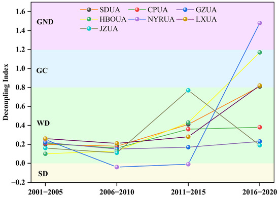 During 2001–2020, the decoupling between economic growth and carbon emissions exhibited considerable instability, with no consistent evolutionary trajectory observed across different scales (Figure 8), which is consistent with the findings of Du et al. [54]. Notably, WD shows the highest persistence across periods, while SD and GND tend to be more transitional. A bipolarization trend emerged after 2011, with GND states expanding rapidly in 2016–2020, especially in SDUA, LXUA, NYRUA, and HBOYUA. This is closely linked to the dominance of high-energy industries, the delayed green transition, and rising energy use from industrial relocation. Such instability in decoupling trajectories has also been reported in other regional contexts [55], suggesting that fluctuations may be a common feature in economies with uneven industrial upgrading. Key indicators further corroborate this: EI increased by 12–17%, IS expanded by 5–10% toward secondary industries, and coal still accounted for about 65–70% of energy consumption in 2020.