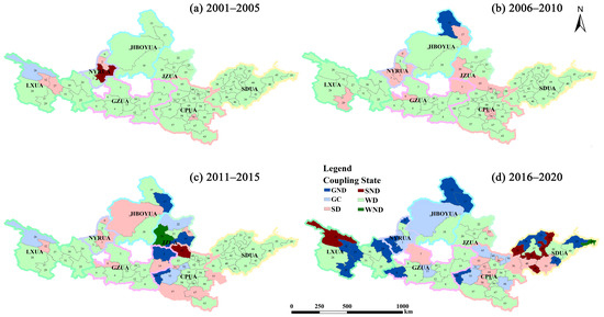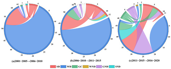 Figure 7 illustrates the transition characteristics of city-level decoupling states in the YRB across different periods. It is evident that WD has been the dominant state among cities in YRB urban agglomerations during 2001–2020. In terms of the evolution process, the number of SD cities remained relatively stable at around 10, but their spatial distribution changed significantly (Figure 8). The number of WD cities fluctuated considerably, decreasing from 63 in 2001–2005 to 29 in 2016–2020. Among them, 15.87% shifted to SD, 12.70% to GC, 19.05% to GND, 7.94% to SND, and 1.59% to WND. The number of cities in GC and GND states showed an increasing trend over the years. By 2016–2020, the counts of GC and GND cities had risen to 9 and 14, respectively. Spatially (Figure 8d), GC cities are mainly located in the CPUA, while GND cities are primarily found in the LXUA and SDUA. There is only one WND city, located in the SDUA (Weihai City). Compared to 2001–2005, the number of SND cities increased significantly by 2016–2020, reaching six. These cities are Zibo, Zaozhuang, Dongying, Tai’an, Liaocheng, and Haibei Tibetan Autonomous Prefecture.
