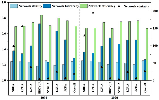 Compared with 2001 (Figure 9), the ND of all YRB urban agglomerations increased by 2020, except for NYRUA, indicating a greater degree of internal spatial association of carbon emission decoupling within most agglomerations (Appendix A, Table A6). Nevertheless, the overall ND values remain relatively low, reflecting weak internal linkages and limited cooperation on emission reduction among constituent cities. By contrast, inter-agglomeration ND values are relatively higher, suggesting that cross-agglomeration decoupling associations are stronger than intra-agglomeration ones. Regarding NH, a general downward trend is observed, suggesting a progressive weakening of rigid hierarchical structures and a growing influence of more evenly distributed spatial associations. However, CPUA and NYRUA deviate from this trend, with increasing NH values indicating the persistence of hierarchical dominance by a few core cities. As for NE, values declined overall, reflecting fewer redundant links and the formation of more overlapping and efficient connections as internal cohesion strengthens. This indicates enhanced stability of the spatial association network. Nonetheless, NE values remain above 0.65, pointing to considerable potential for further strengthening both intra-agglomeration and inter-agglomeration decoupling connections. Finally, the number of network contacts generally increased, except in HBOYUA and LXUA, suggesting rising cohesion of decoupling effects within most agglomerations. However, both intra-agglomeration and overall connections remain below their maximum possible levels. For instance, in CPUA, the theoretical maximum number of contacts is 380 (20 × 19), whereas the actual numbers in 2001 and 2020 were 156 and 195, respectively. This gap underscores the continued insufficiency of network density and indicates substantial room for enhancing spatial cooperation on carbon emission decoupling.