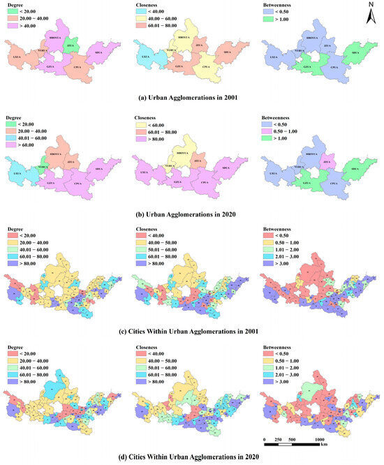 From the overall perspective of YRB urban agglomerations, both the DC and CC increased from 2001 (Figure 10a) to 2020 (Figure 10b), whereas BC remained largely unchanged (Appendix A, Table A7). SDUA and GZUA consistently exhibited relatively high values across all three-centrality metrics, suggesting that they function as key hubs in connecting regions and regulating the spatial spillovers of carbon emission decoupling. At the intra-agglomeration level (Figure 10c,d), cities such as Linyi, Weihai, Tai’an, Zhengzhou, Xi’an, Xianyang, and Hainan Tibetan Autonomous Prefecture maintained high DC levels in both 2001 and 2020, indicating that the carbon emission decoupling effects of these cities are tightly linked to others and hold a key position in the overall regional network. Regarding CC, cities including Qingdao, Weihai, Weifang, Zhengzhou, Luoyang, Xi’an, Tongchuan, and Shangluo maintained high CC levels in both 2001 and 2020, showing that they serve as principal hubs in the carbon emission decoupling spatial network and play an essential part in guiding other cities in the diffusion of carbon reduction factors. For BC, cities such as Rizhao, Weihai, Weifang, Zhengzhou, Kaifeng, Xi’an, Baoji, and Shangluo maintained high levels, highlighting their bridging functions within the network and their influence on regional carbon reduction efforts through the mediation of resource flows.