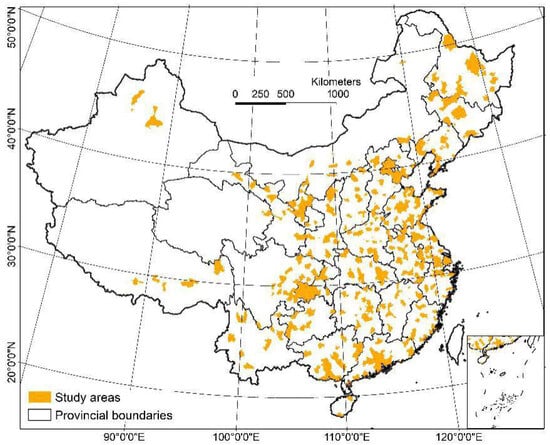 Many previous studies have investigated the characteristics of urban expansion in China from the perspective of land urbanization at multiple scales (the entire country, megaregion, provincial level, and city) [18,19,20]. However, few studies have considered the imbalances between land conversion and population growth at a national scale over the past few decades. To explore the widespread temporal–spatial characteristics of these imbalances, we need to include, as much as possible, all cities across China.
