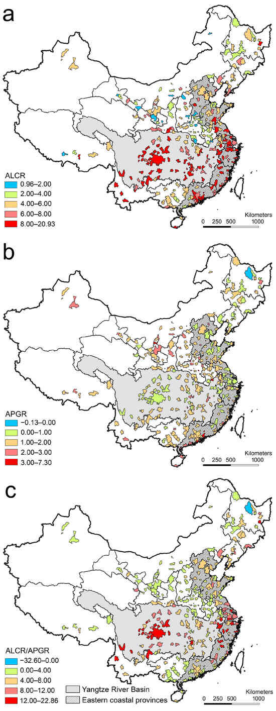 Second, the ALCR/APGR ratio was widespread and temporally dynamic: over 95.8% of cities had a land conversion rate that was higher than the population growth rate (mostly in the eastern coastal and Yangtze River Basin region), and the ratio decreased in 1986–1990 before increasing in 1991–2000 and 2001–2010.