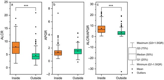 Variations in urban development for cities in China inside and outside the eastern coastal province/Yangtze River Basin: (a) annual land conversion rate (ALCR), (b) annual population growth rate (APGR), and (c) ALCR/APGR ratio. *** indicate significant differences between inside and outside regions (p < 0.001).