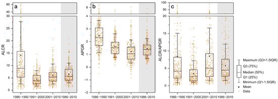 Variation in urban development over time (1986–2010) for cities across China: (a) annual land conversion rates (ALCR), (b) annual population growth rate (APGR), and (c) ALCR/APGR ratio.