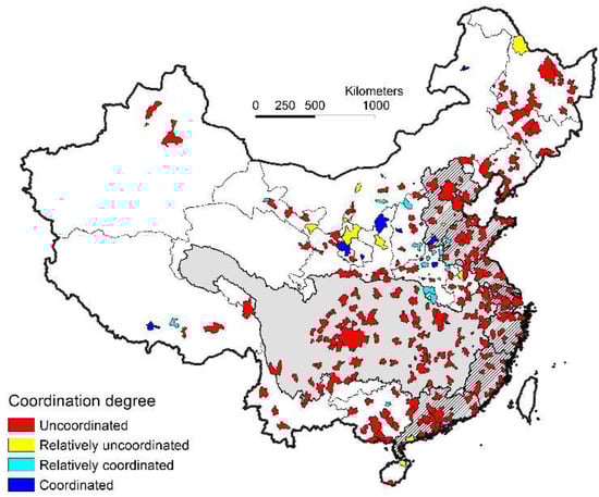 Spatial heterogeneity of coordination degree between land expansion and population growth during the 1986–2010 period.