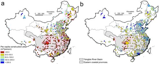 The land conversion rate and the ratio between the land conversion and population growth rates showed obvious spatial heterogeneity across China, which have been stated by many previous studies [17,28,29]. In this study, we divided China into two regions: (1) the Yangtze River Basin and eastern coastal provinces region, and (2) other areas outside this region. The land urbanization rate in the Yangtze River Basin and the eastern coastal provinces was significantly higher than in other areas of the country, and this region is where China’s five major urban agglomerations are located, namely Beijing–Tianjin–Hebei, the Yangtze River Delta, the Guangdong–Hong Kong–Macao Greater Bay Area, the middle reaches of the Yangtze River, and the Chengdu–Chongqing urban agglomeration. The formation of these five urban agglomerations showed an obvious trend in the process of land urbanization from 1986 to 2010. The cities in these five urban agglomerations (distributed in the Yangtze River Basin and the eastern coastal provinces) had a significantly higher land urbanization rate than those outside the region. The per capita construction land area of the first three urban agglomerations has reached more than 100 m2/person in 2010, but that of the other two urban agglomerations, especially the Chengdu–Chongqing urban agglomerations, remained at a relatively low level (<50 m2/person). This may lead to ongoing rapid land urbanization in these two urban agglomerations’ cities in the following period of time.
