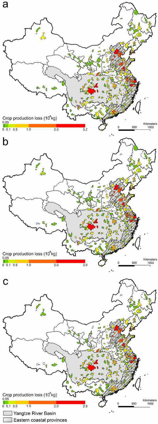 Crop production loss in selected Chinese cities under three annual land conversion rate/annual population growth rate (ALCR/APGR) scenarios: (a) Scenario 1, (b) Scenario 2, and (c) Scenario 3.