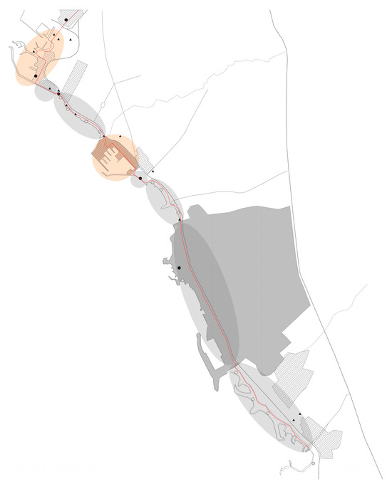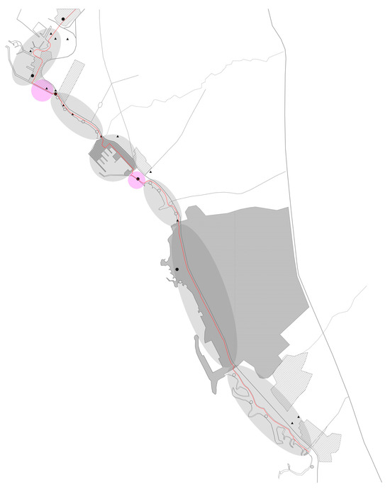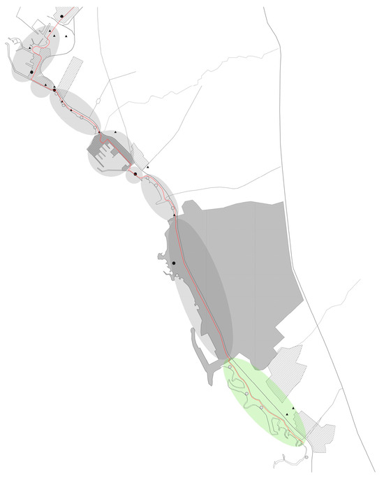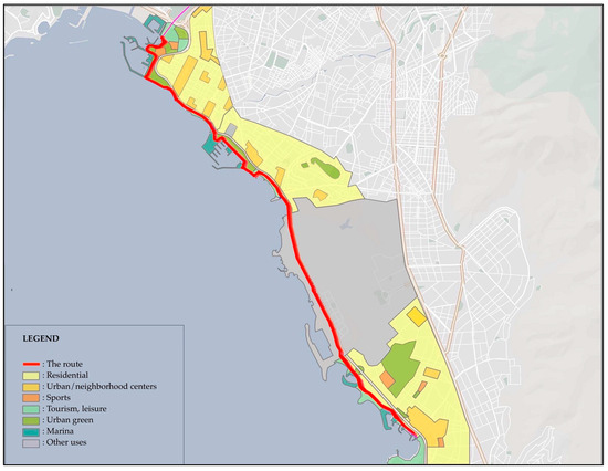 Most of the land uses around the route are recreational, with urban green space, marinas, and touristic/leisure activities (Figure 2). An important restriction of the chosen area, in terms of having access to the proposed design and/or suggesting ideas/interventions, is that a part of it (gray colored in Figure 2) is “The Ellinikon” project, which is under construction; thus, for this specific part, only a brief reference will be made.