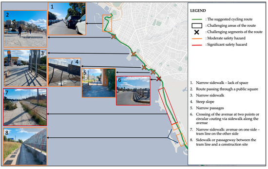 Regarding the morphology of the cycling route, certain segments are considered hazardous (Figure 4), primarily due to their close proximity to Poseidonos Avenue and, consequently, the increased vehicular traffic or the tram line. Nevertheless, several other factors also contribute to the lack of safety in the existing conditions. These include insufficient sidewalk width, passage through public squares or shared-use low-traffic roads, and narrow or constrained sections of the route.