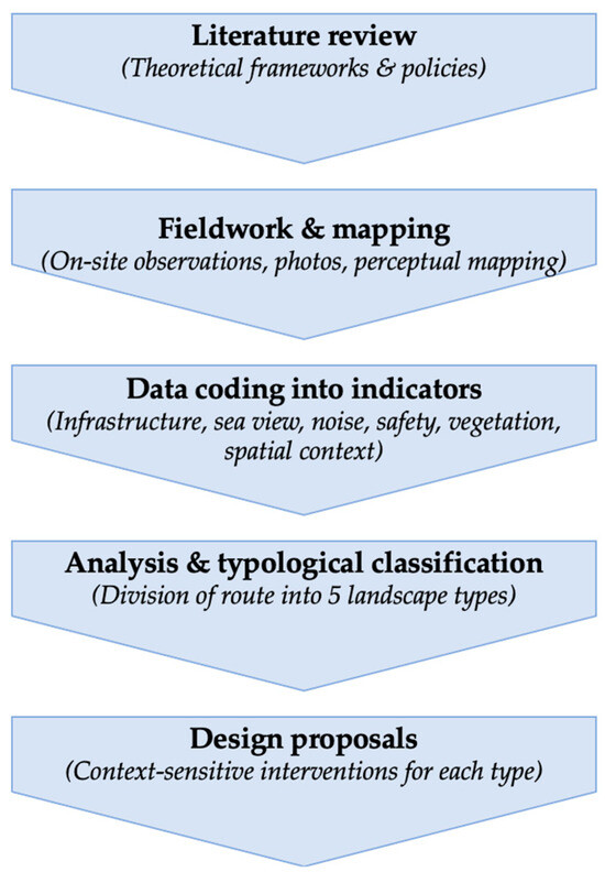 The methodological process is summarized in a step-by-step flowchart (Figure 5). It outlines the sequence from literature review and fieldwork, through the coding of indicators (e.g., sea views, noise, safety, vegetation, infrastructure), to the classification of five landscape types from which the design proposals were derived (Figure 5).