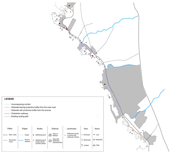 Before presenting the proposed intervention, it was deemed appropriate to first illustrate the existing conditions on a map, compiled from a combination of sources, including the literature review, Kevin Lynch’s theory as outlined in his book The Image of the City, satellite imagery, the desk analysis of the study area, and on-site fieldwork. As such, the conceptual base includes Lynch’s principles of legibility and imageability [8], Cullen’s approach to sequential space [9], and more recent works on green mobility and perceptual urbanism [21].