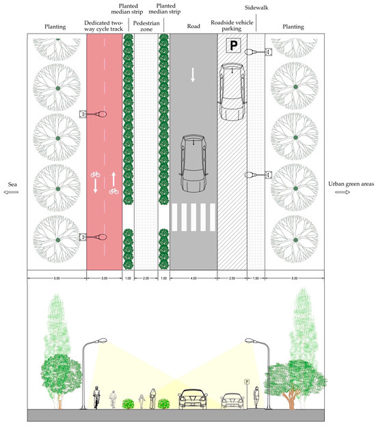 This differentiation underscores the importance of context-sensitive design. Rather than imposing a uniform infrastructural model, the study advocates tailoring interventions to the specific character of each segment. This aligns with the emerging landscape approach in cycling infrastructure planning, which pays attention to the integration of ecological, aesthetic, and social dimensions into transport networks [16]. In the current study, such integration was achieved through targeted planting strategies, surface material selection, lighting design, and the incorporation of small-scale interventions such as shaded rest stops and multisensory plant palettes.