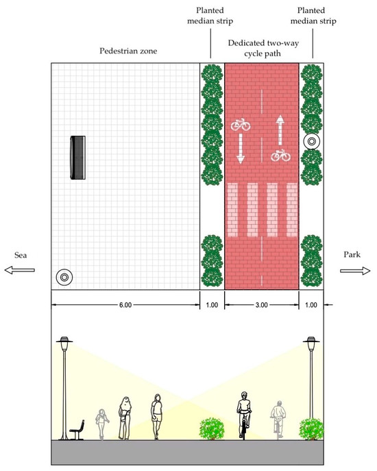 Within this context, the design and implementation of cycling infrastructure—especially in complex urban environments like coastal zones—requires not only functional efficiency but also an understanding of how space is perceived and experienced by users [8]. Nevertheless, the impact of urban natural landscape on how it is perceived and valued for cycling remains largely understudied [5]. Urban mobility systems worldwide are being re-evaluated in light of climate change, rising energy costs, and public health crises related to sedentary lifestyles [9]. Cities are facing significant pressure to reduce carbon emissions, encourage physical activity, and reclaim public space from automobile dominance. Cycling infrastructure, when well integrated and thoughtfully designed, contributes directly to these goals. However, many existing urban cycling systems are inadequate or fragmented, or they fail to consider the qualitative, experiential dimensions of movement through space [10], and green infrastructure is often either underestimated or poorly incorporated into the urban corridors’ cycling design. Moreover, infrastructure designed purely for technical performance—such as continuity or pavement quality—often neglects the user’s visual, spatial, and emotional experience of the route [11,12].