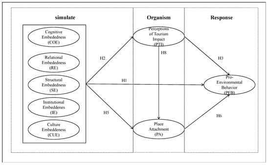 Based on the S-O-R theoretical framework, social embeddedness serves as an external stimulus source that ultimately affects pro-environmental behavioral practices through the dual mediating paths of perceptions of tourism impacts and place attachment. Based on this analysis, the following hypotheses are proposed: