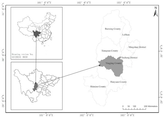 Baoxing County, located in Ya’an City, Sichuan Province, is the scientific type locality of the world’s first giant panda (Ailuropoda melanoleuca), discovered and named by French missionary Armand David in 1869. As a core area of the park (Figure 2), 81.7% of the county’s territory is incorporated into the park, supporting an average density of one wild giant panda per 17 km2 [74].
