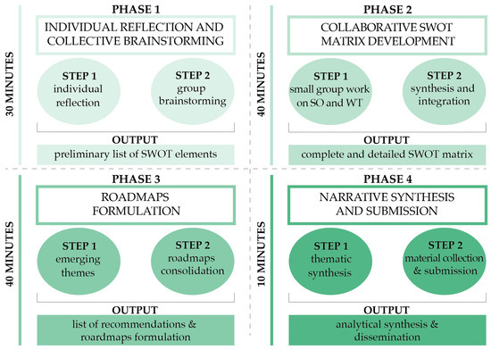 The objective of the working tables was twofold: (1) developing a collective SWOT analysis on the assigned topics, and (2) translating the analysis into strategic and design-oriented roadmaps. This process was intended not merely as a moment of engagement but as a foundational step toward producing a collective output that synthesizes the results and reflections emerging from each table. The methodology unfolded through four consecutive phases, combining individual analysis, group discussion, strategic synthesis, and narrative integration (Figure 1). The chosen structure drew on collaborative planning traditions and was influenced by practices in transdisciplinary research workshops, particularly those that have successfully used SWOT analysis as a collective inquiry and planning tool (e.g., [49,50,51]).