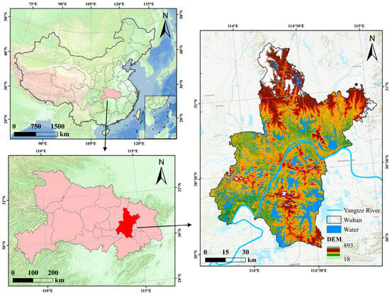 Wuhan City (Figure 1) is situated in central China’s hinterland, eastern Hubei Province (113°41′–115°05′ E, 29°58′–31°22′ N). It lies at the confluence of the Yangtze and Han Rivers, positioned within the transition zone between the eastern fringe of the Jianghan Plain and the hilly southern foothills of the Dabie Mountains. The city covers a total land area of 8569.19 km2. Wuhan City is endowed with extremely abundant water resources. It features 165 rivers longer than 5 km, 166 lakes listed in the protection directory, and 262 reservoirs. Since the beginning of the 21st century, Wuhan City has undergone rapid urbanization. By the end of 2020, the city’s permanent resident population reached 12.32 million, with an urbanization rate as high as 84.31%. The built-up area has expanded significantly due to the concentration of population. It grew from 210 km2 in 2000 to 885.11 km2 in 2020, which is an increase of approximately 4.21 times. The rapid expansion of non-ecological land use has led to a decrease in ecological land and increased ecological space fragmentation.