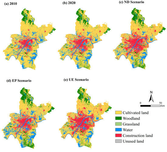 - Rapid urbanization in Wuhan has led to significant changes in land use patterns. Historical trends from 2010 to 2020 indicate a significant expansion of construction land, primarily encroaching upon cultivated land and water bodies. Although the woodland area increased, spatial mismatch prevented it from effectively offsetting the negative impacts of urban expansion on ecological spaces. Under the urban expansion (UE) scenario, construction land not only directly converted cultivated land but also triggered a “urban expansion—reduction of cultivated land—encroachment on woodland/water bodies” chain reaction, intensifying the compression and fragmentation of ecological space. Conversely, under the ecological protection (EP) scenario, strict ecological protection policies effectively promoted the restoration of ecological spaces.