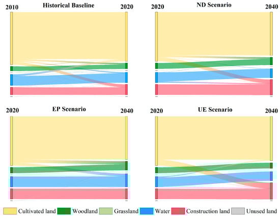 Land use transfer Sankey diagrams in different scenarios.