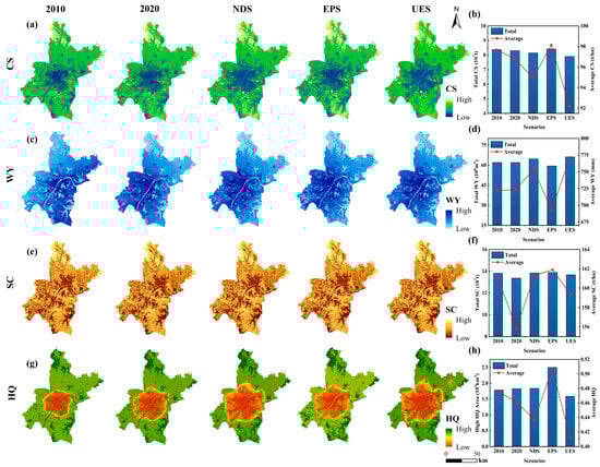 Spatial distribution and variation in carbon storage (CS), water yield (WY), soil conservation (SC), and habitat quality (HQ) 2010–2040. (a–h) Spatial distribution and corresponding statistical metrics for CS, WY, SC and HQ across the years 2010, 2020, and the three scenarios (NDS, UES, EPS) in 2040.