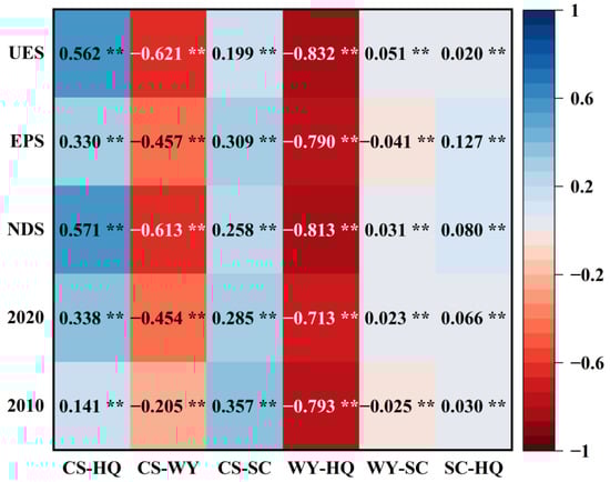 As shown in Figure 5, the Spearman correlation coefficients among ES in Wuhan City reveal distinct interrelationships. Specifically, CS-HQ, CS-SC, and SC-HQ exhibit synergistic relationships, while CS-WY and WY-HQ demonstrate trade-offs. The correlation direction of WY-SC varies across different land use patterns. The coexistence of ecological restoration and urban expansion has resulted in complex dynamics in ES trade-offs and synergies. By 2020, the trade-off between WY and HQ had weakened, whereas the CS-WY trade-off intensified. Synergies between CS-HQ and SC-HQ strengthened, while the CS-SC synergy diminished. Notably, the WY-SC relationship transitioned to synergy.