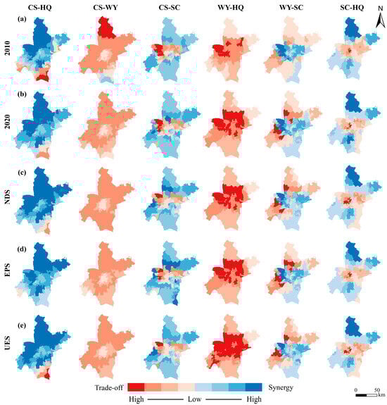 Under future land use scenarios, the spatial distribution patterns of ES trade-offs and synergies remain generally consistent with 2020, but their relationship intensities show significant differentiation. Under the ND scenario, 82% of townships experienced increased synergy intensity for CS-HQ. For other ES pairs, the proportion of townships with increased trade-off intensity significantly exceeded historical 2010–2020 levels: CS-WY (55%), CS-SC (13%), WY-HQ (95%), WY-SC (26%), and SC-HQ (46%). The EP scenario featured coexisting enhanced synergies and residual trade-offs. CS-SC and WY-SC reached peak scenario values for townships with increased synergy intensity (31% and 33%, respectively), while SC-HQ showed a higher proportion of townships with reduced trade-off intensity (31%) than other scenarios. Additionally, 3% of townships achieved a transition from trade-off to synergy for CS-HQ. Conversely, the proportion of townships with increased CS-HQ synergy intensity (52%) was relatively weaker than in other scenarios. Conflict intensified further among ES pairs under the UE scenario. Townships with increased WY-HQ trade-off intensity reached 95%, driving the outward diffusion of high-trade-off zones from the urban center. The proportions of townships with decreased CS-SC, WY-SC, and SC-HQ synergy intensity (19%, 47%, and 28%) and increased trade-off intensity (13%, 22%, and 49%) were all higher than under other scenarios.