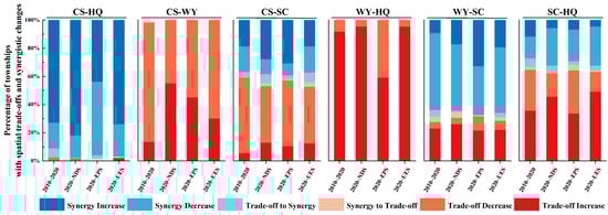 A total of 18% showed a decrease, and an additional 7% transitioned from trade-off to synergy. Trade-offs for CS-WY and CS-SC generally weakened (85% and 54% of townships, respectively). The trade-off for WY-HQ intensified significantly (92% of townships). Conflict for WY-SC overall intensified, with 55% of townships experiencing a decrease in synergy intensity, 23% seeing an increase in trade-off intensity, and 4% shifting from synergy to trade-off. SC-HQ remained dominated by trade-offs, with 36% of townships showing increased trade-off intensity, and only 12% showing increased synergy intensity. Spatially, the overall pattern of ES relationships remained relatively stable between 2010 and 2020; the increased synergy intensity of CS-HQ led most originally trade-off townships to become synergistic, causing the spatial trade-off zone to contract and persist mainly near the southeastern administrative boundary, while the intensified trade-off intensity of WY-HQ prompted the northward expansion of the high trade-off area.