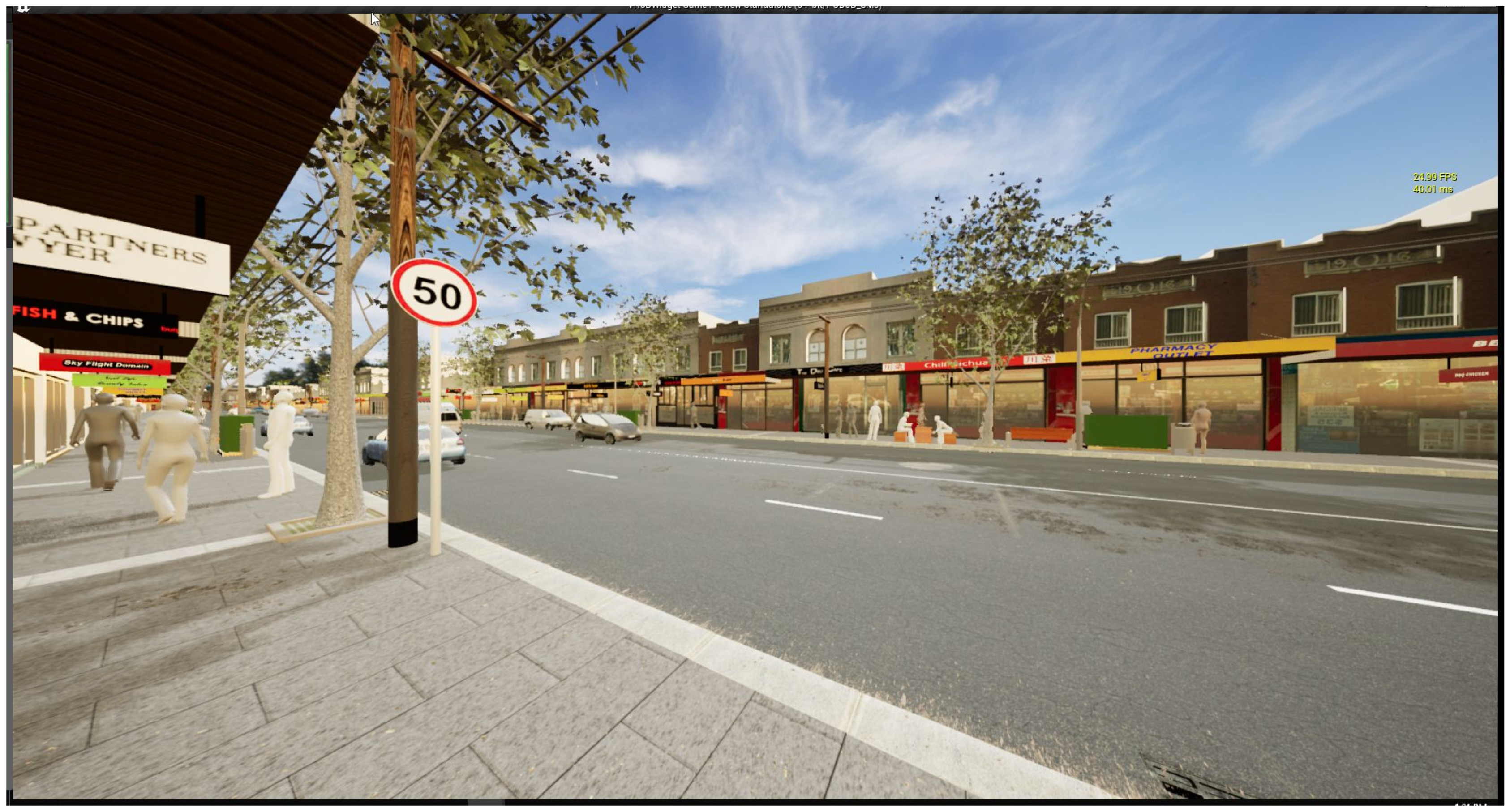 The base geometry replicated a standard 20-metre-wide ‘main street’ featuring footpaths, parking, signage, and line markings, with detailing informed by the relevant Technical Direction: For Traffic and Transport Practitioners documents [