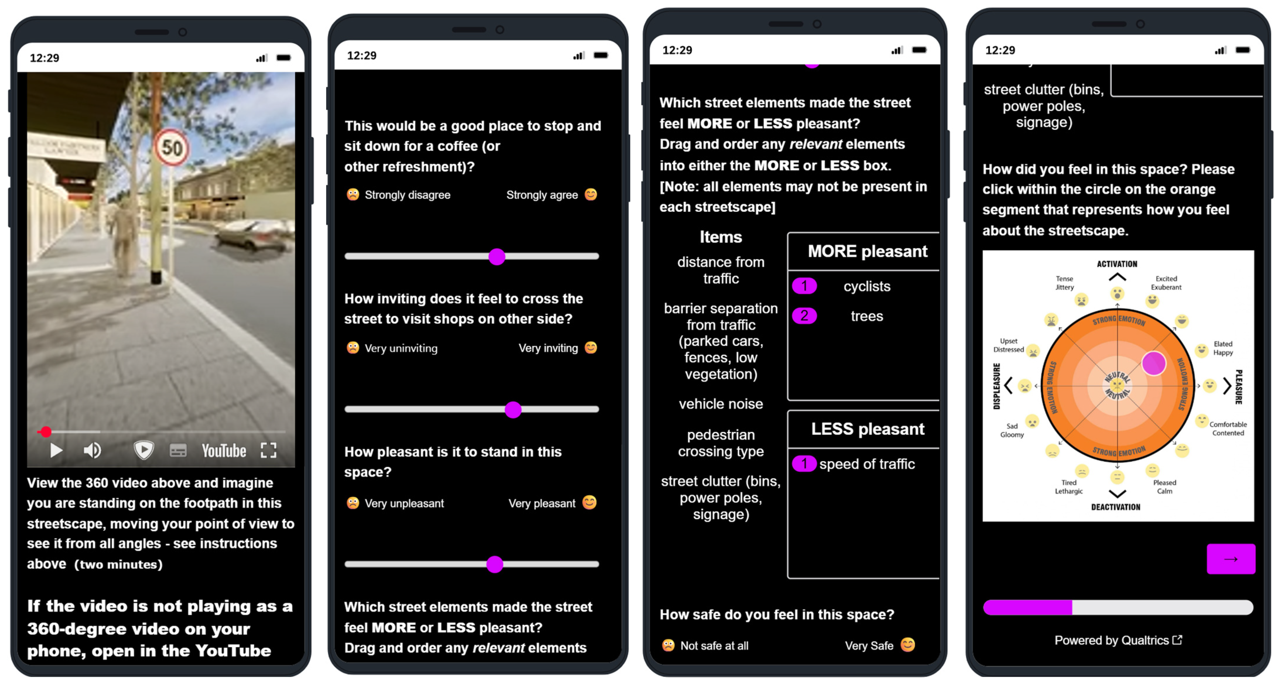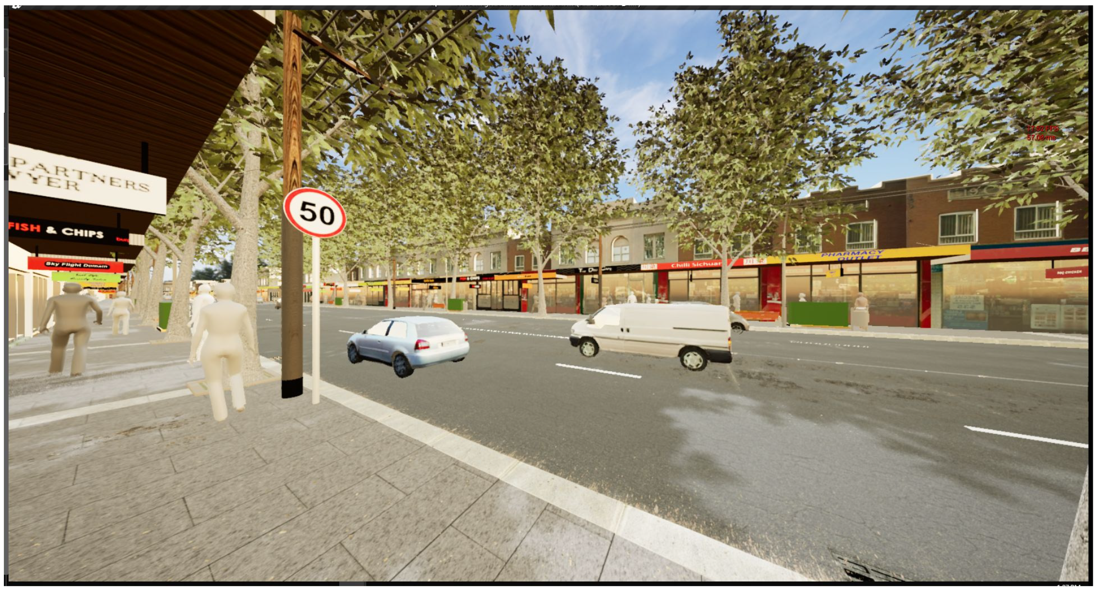 This work was part of a larger study developed in collaboration with the major Transport Authority for the state of New South Wales, Australia (TfNSW), with the key objective of gathering affective, revealed, and stated preferences for a series of streetscape design interventions with the potential to improve perceptions of traffic safety and place. While the broader study tested a range of variables from speed reduction and crossing types to barrier fences and cycle lanes, this paper particularly focuses on the effect of trees on perceptions of safety and place.