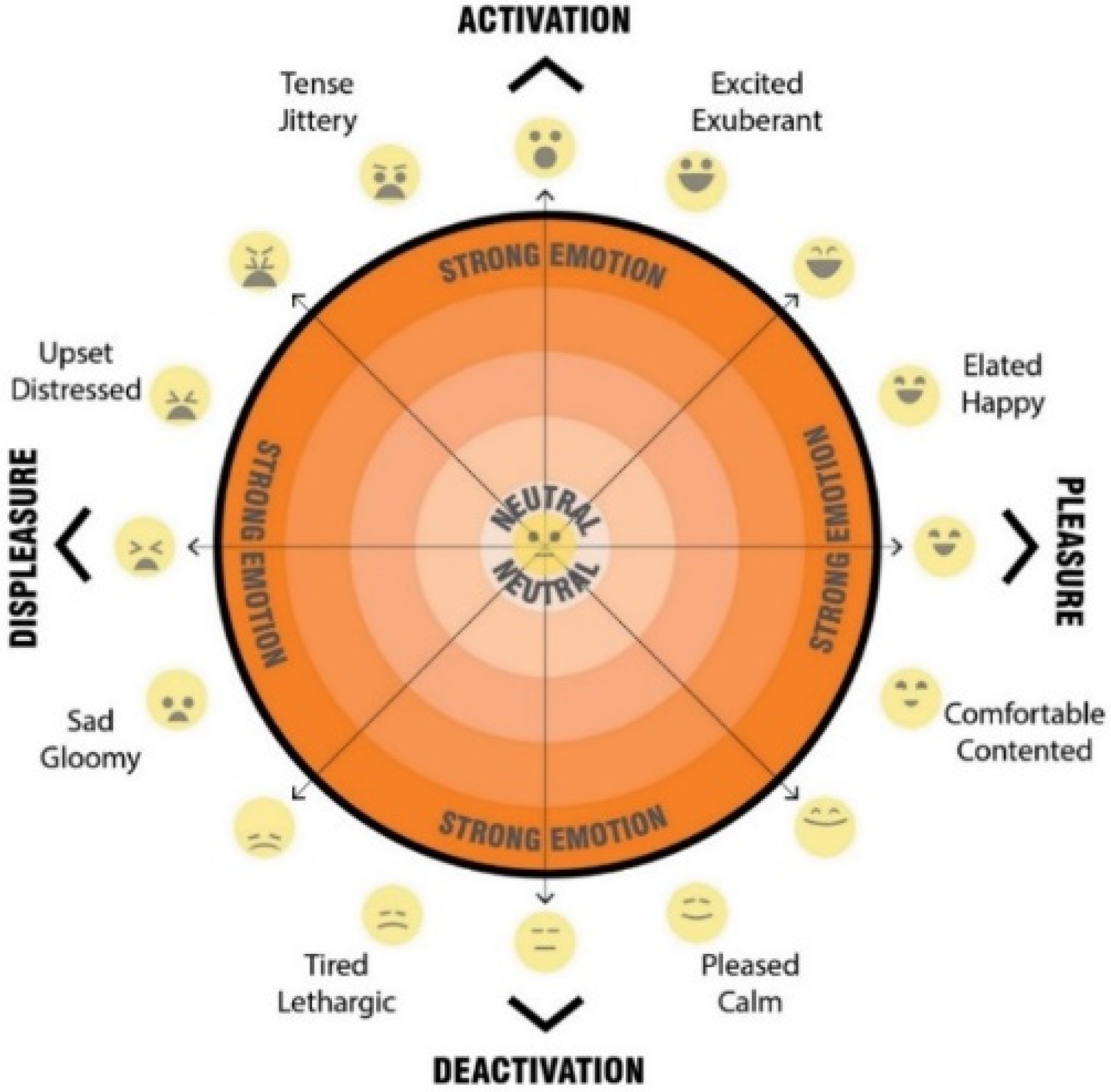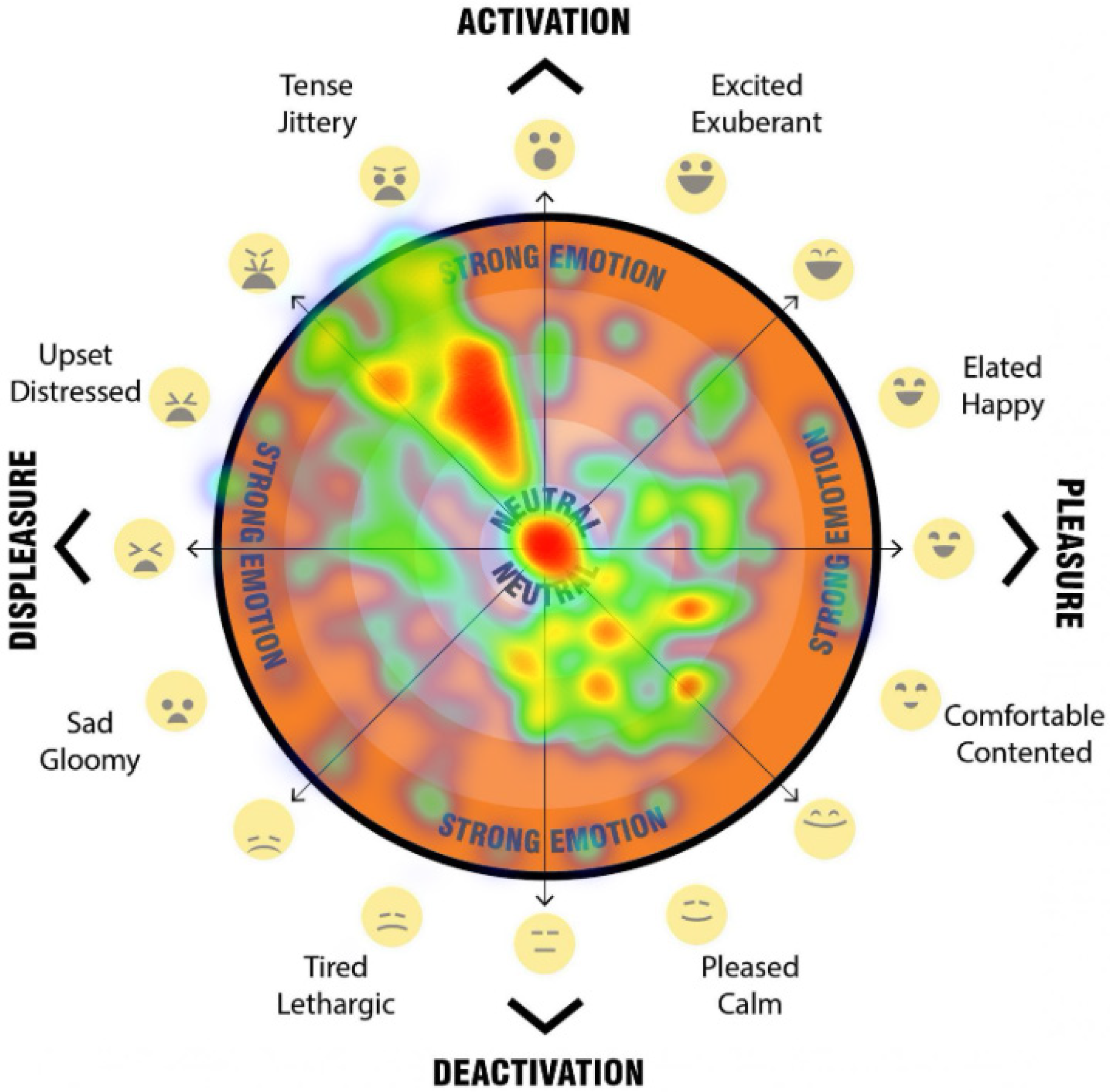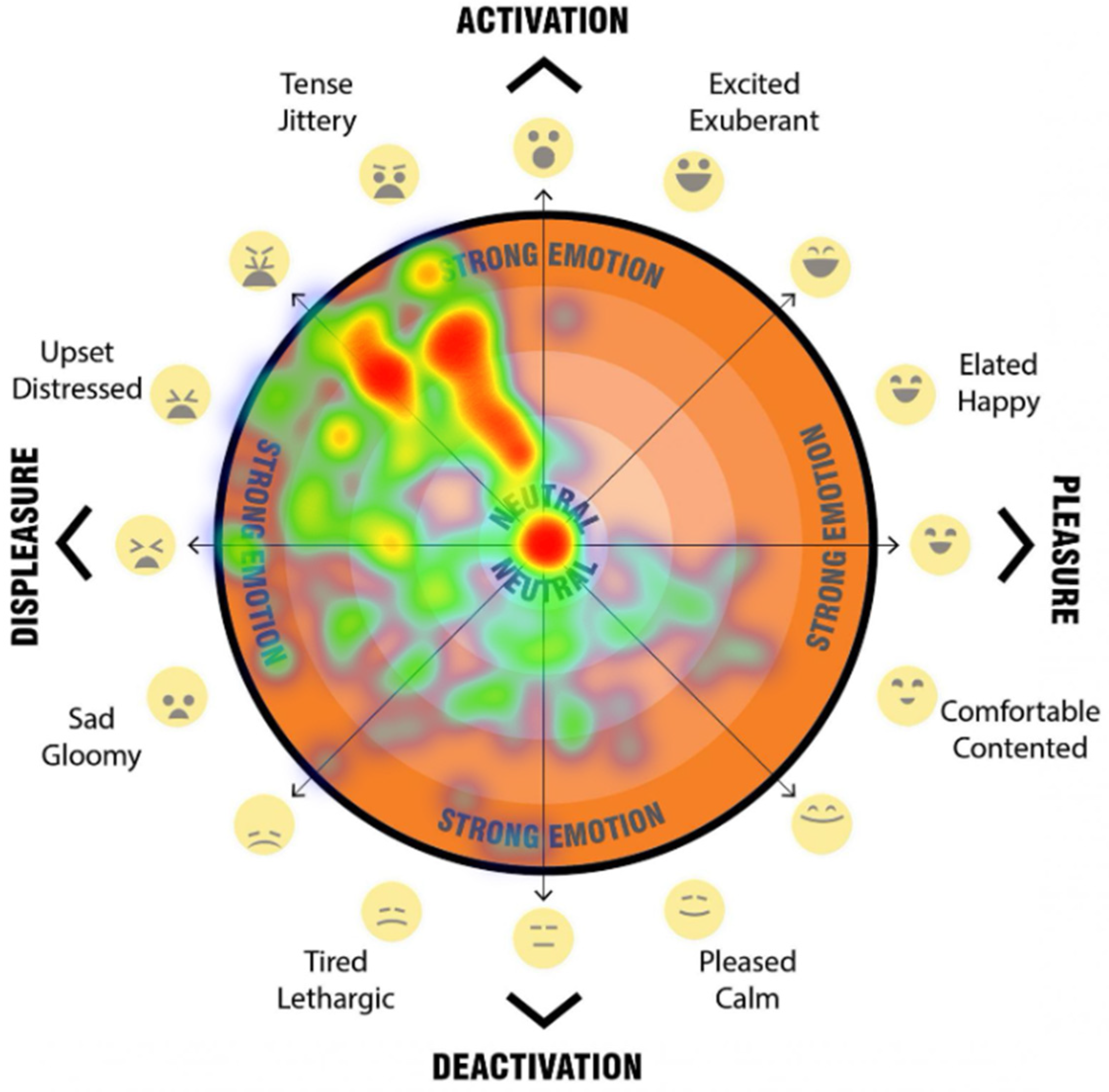 Analysis of the emotional response data revealed a strong overall negative valence across all scenarios. Seventy percent of total responses were classified within the displeasure zone. Within this category, half of all responses (50% of the total) fell into the activation–displeasure quadrant, while 20% were categorised as deactivation–displeasure. Conversely, only 30% of responses were recorded within the pleasure zone. The majority of these (21% of total responses) were characterised as deactivation–pleasure, with a smaller proportion (9%) residing in the activation–pleasure quadrant.