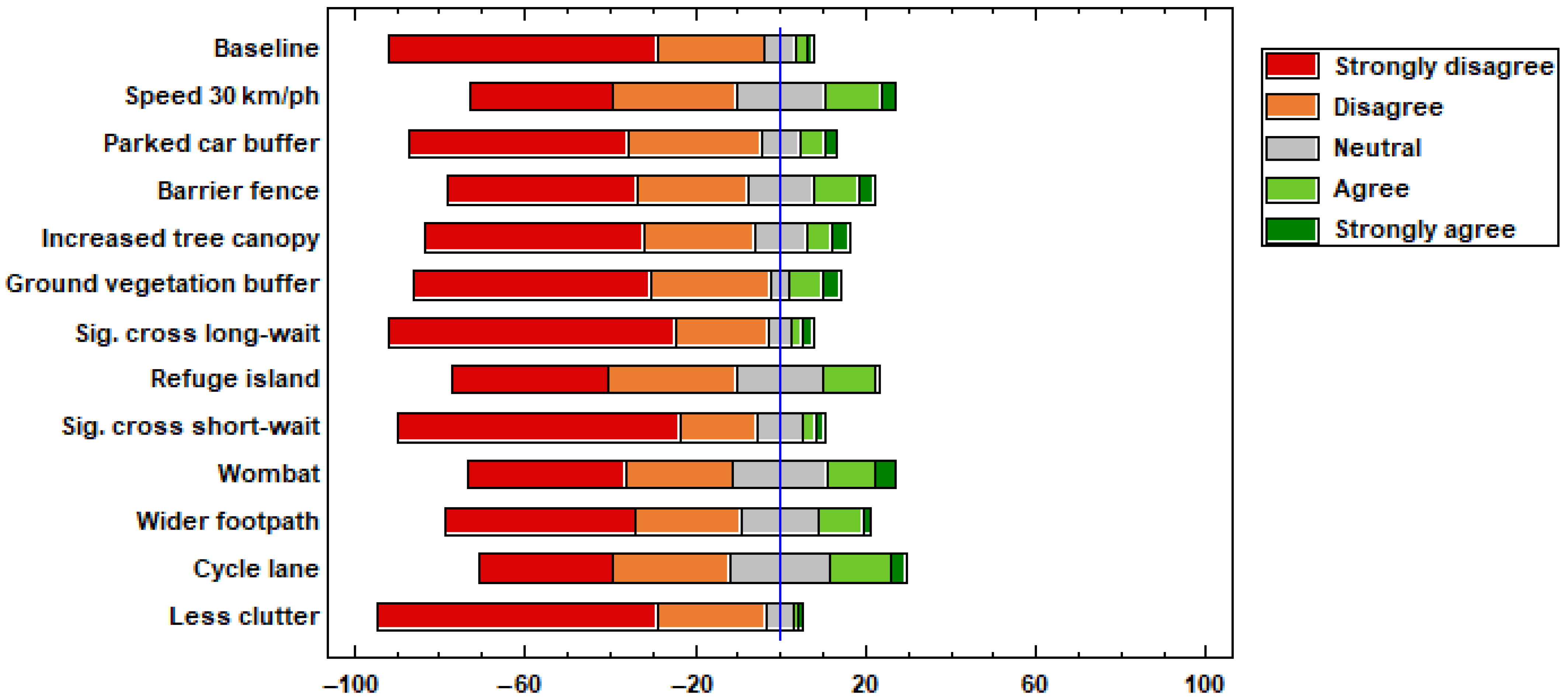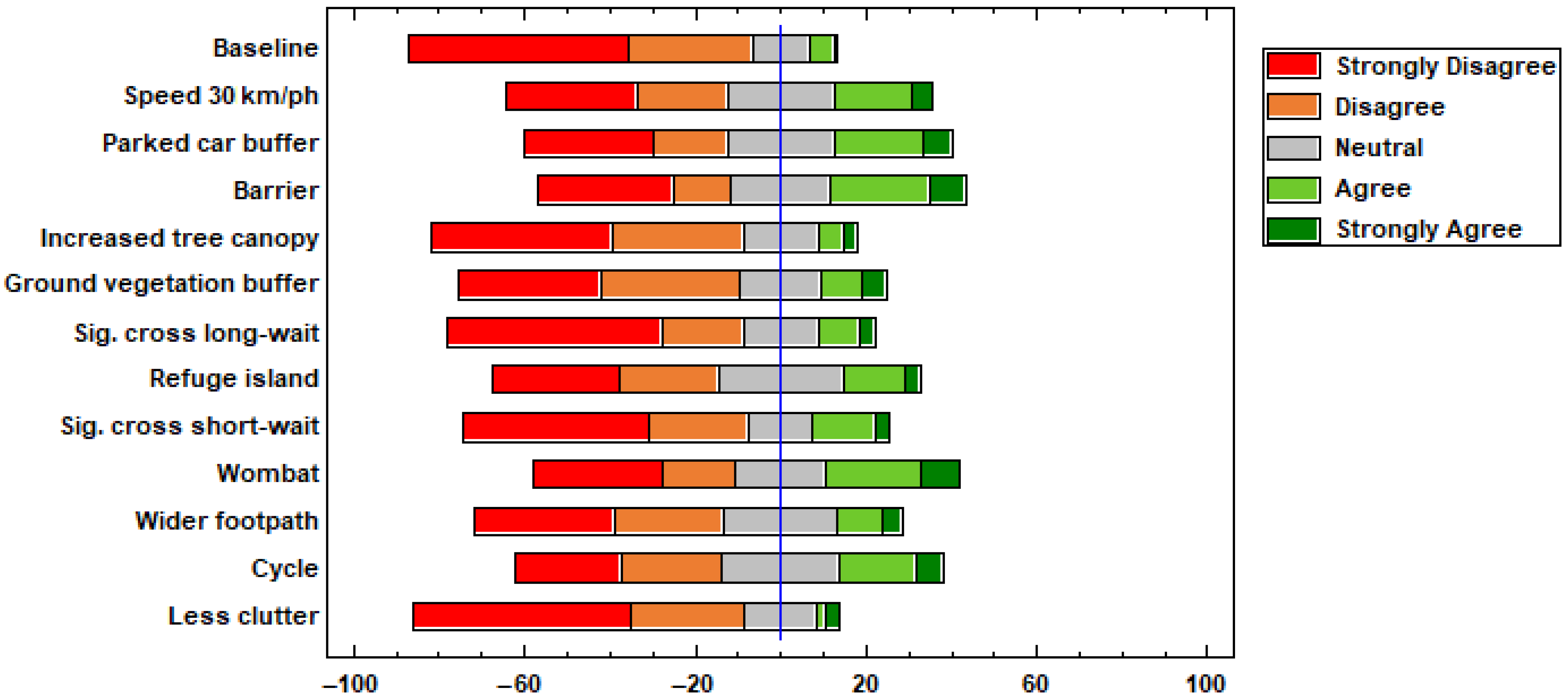 Figure 10), traffic barriers, and separation buffers significantly improve perceived safety. The ‘reduced speed’ and ‘parked car buffer’ scenarios elicited comparable positive/negative responses, suggesting equal importance in safety perceptions. The top-rated scenarios, ‘barrier fence’ and ‘wombat crossing’, share no obvious variable alignment (speed, volume, sound, or separation). ‘Increased canopy’ and ‘ground vegetation buffer’ both received higher levels of ‘strongly agree’ than the ‘baseline scenario’, with ‘ground vegetation buffer’ performing slightly better than ‘increased canopy’.