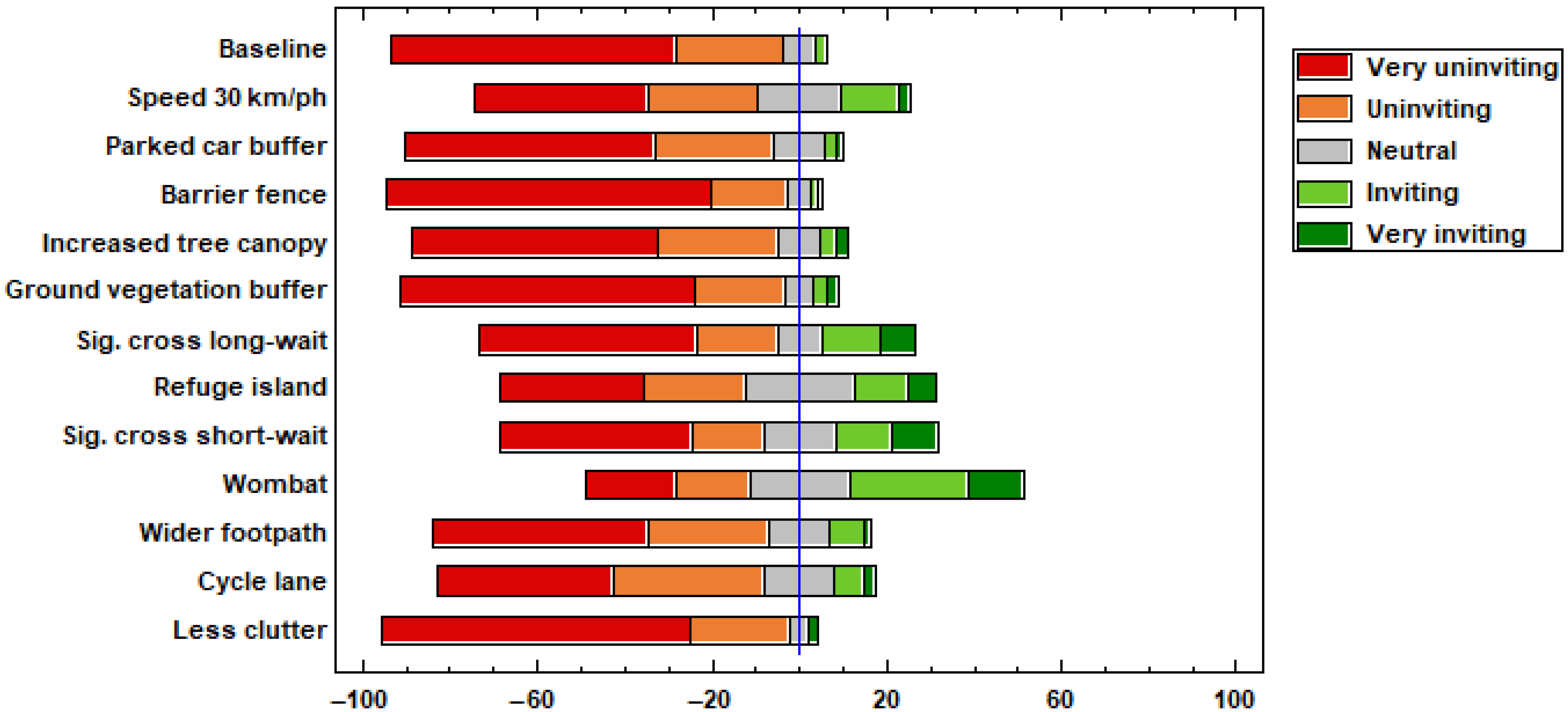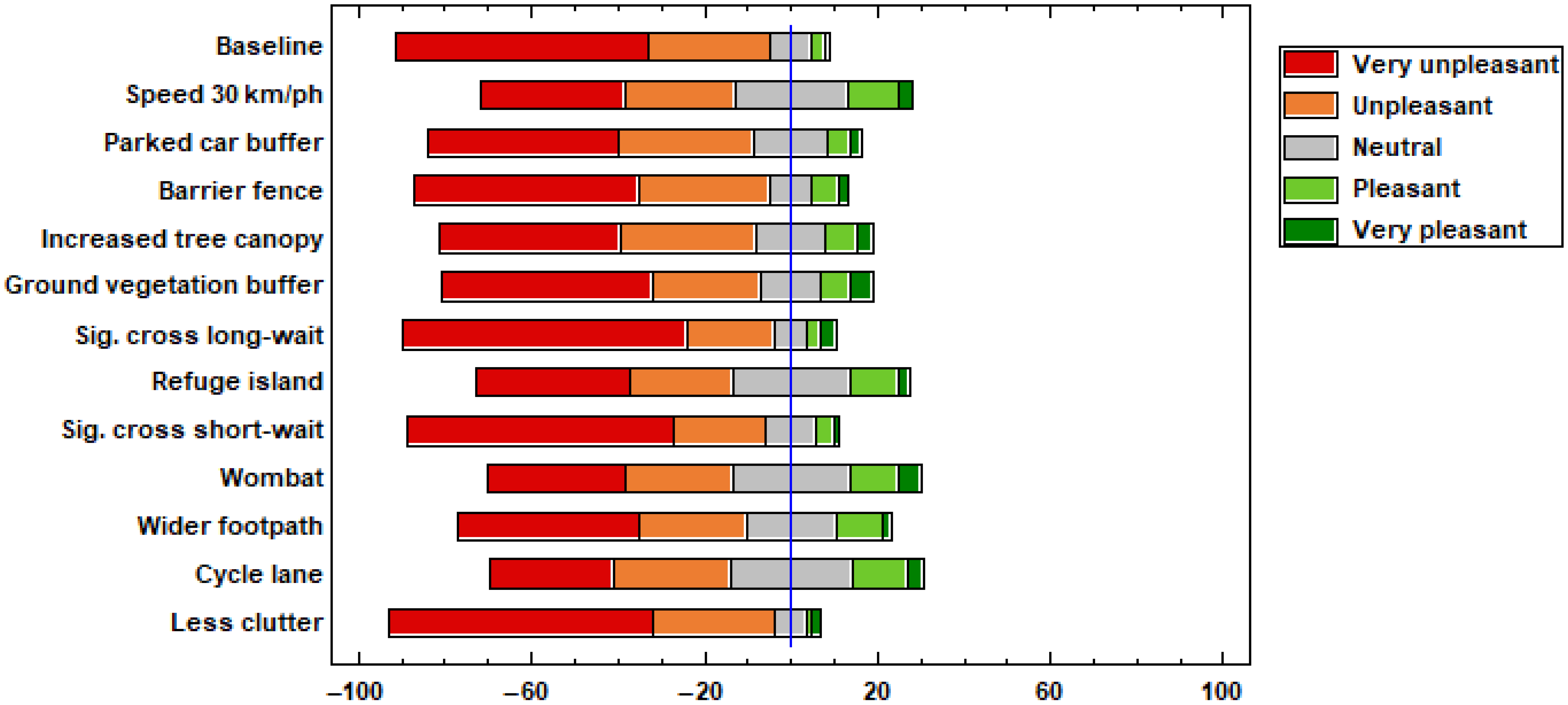 While street trees demonstrated a particularly strong performance, the ground-level vegetation buffer intervention also yielded positive responses, though with less pronounced effects. This may be attributable to several factors: the vegetation buffer’s implementation required footpath width concessions (without altering overall kerb alignment), and the scenario generated fewer responses compared to other interventions (notably ‘increased canopy’, ‘baseline’, ‘barrier fence’, and ‘reduced speed’ scenarios). These methodological considerations likely contributed to the lack of statistically significant findings for this specific intervention.