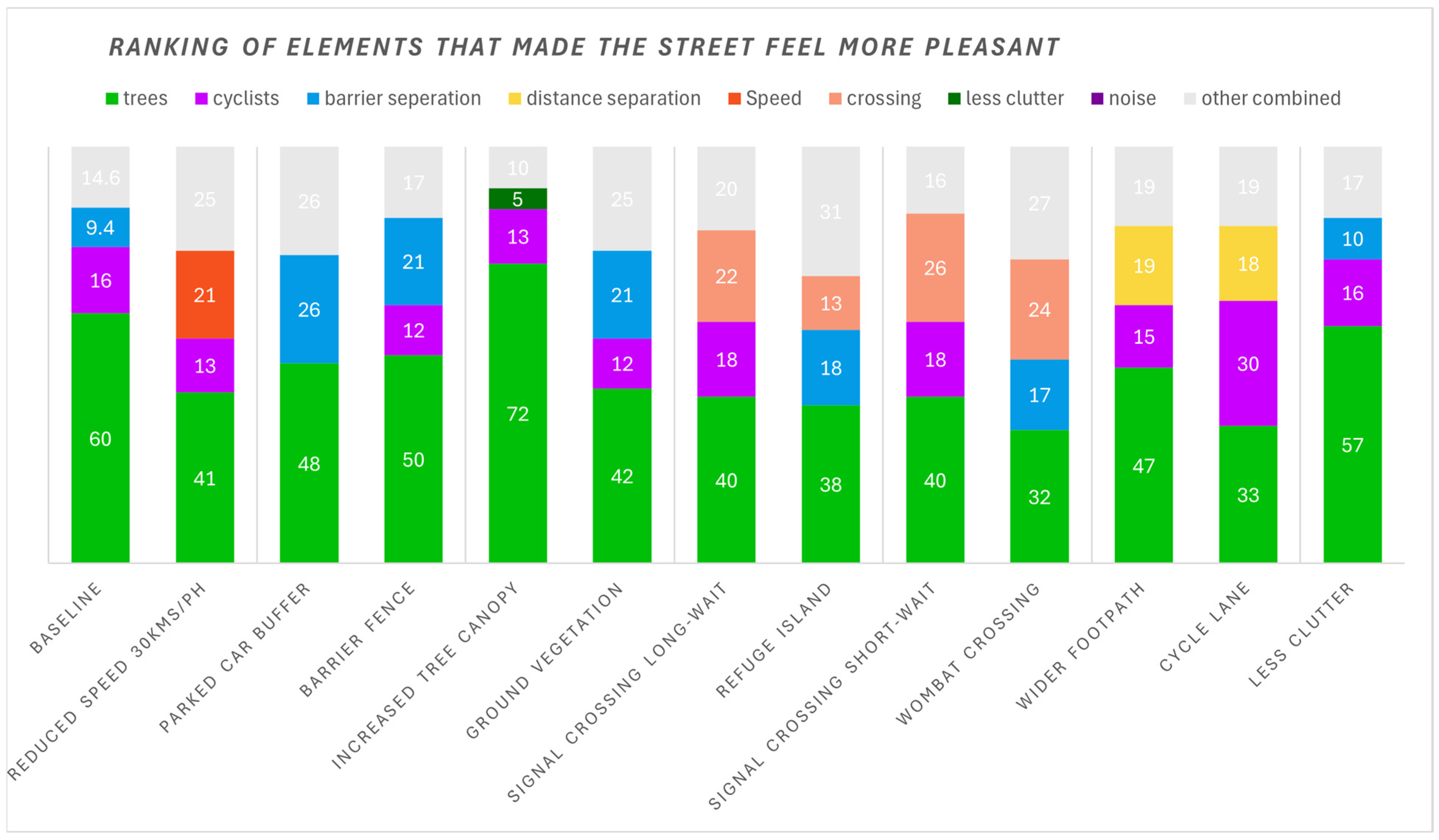 Across all scenarios, the three highest-ranked elements making a street more pleasant were first trees, then separation from traffic, and third the presence of cyclists. Trees were consistently ranked number one across all scenarios for this question. While the ‘drag and drop’ element ‘separation from traffic’ was not specific about how that separation was achieved, key physical differences between the scenarios allowed for this distinction into two spatial types; either barrier-separated (such as the ‘ground vegetation’ and ‘barrier fence’ scenarios, in which traffic speed and volume remain consistent with the baseline) or distance-separated, such as the ‘parked car’ and ‘widened footpath’ scenarios where traffic noise and volume were reduced in order to accommodate the alternative elements within the street.