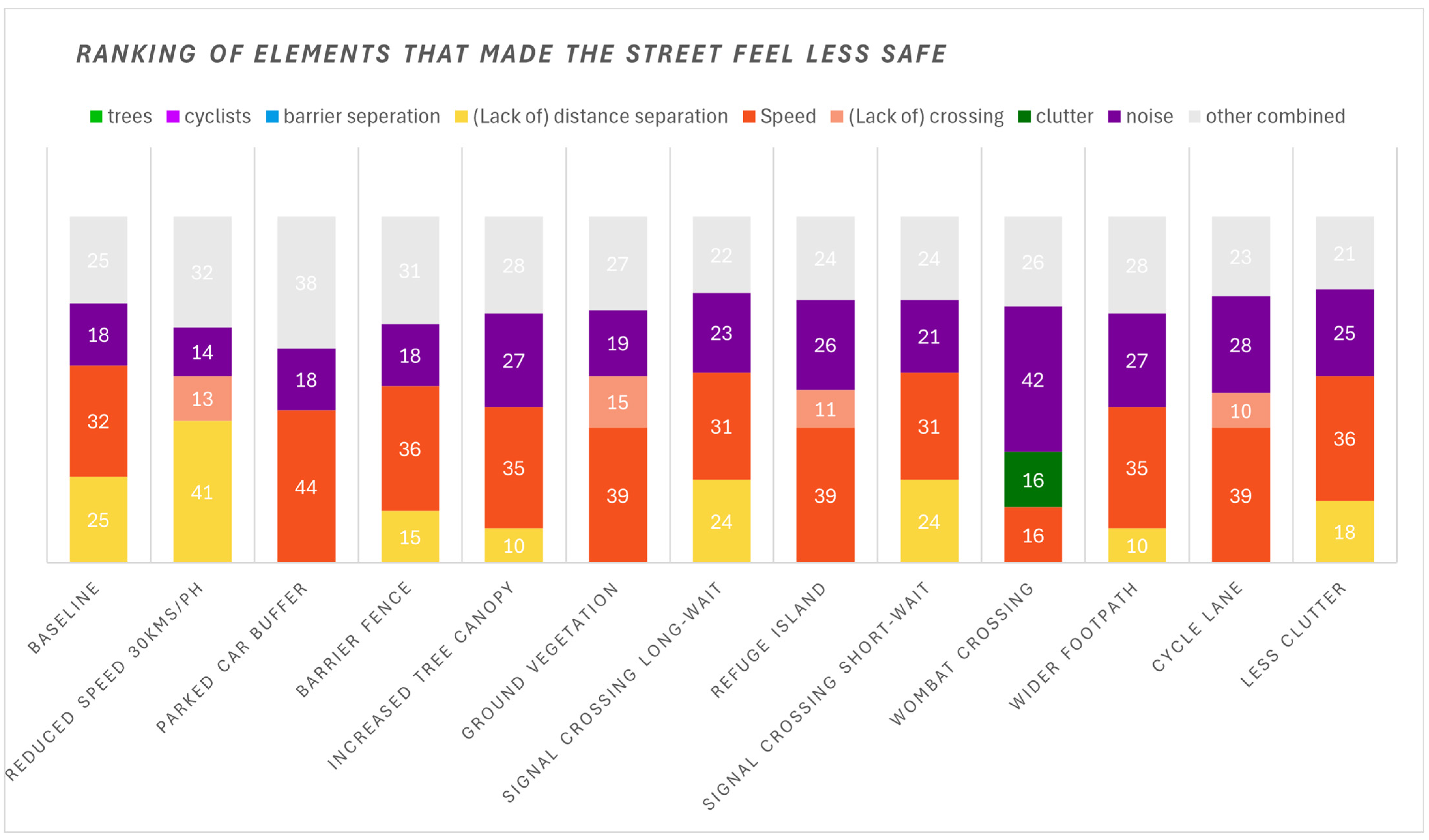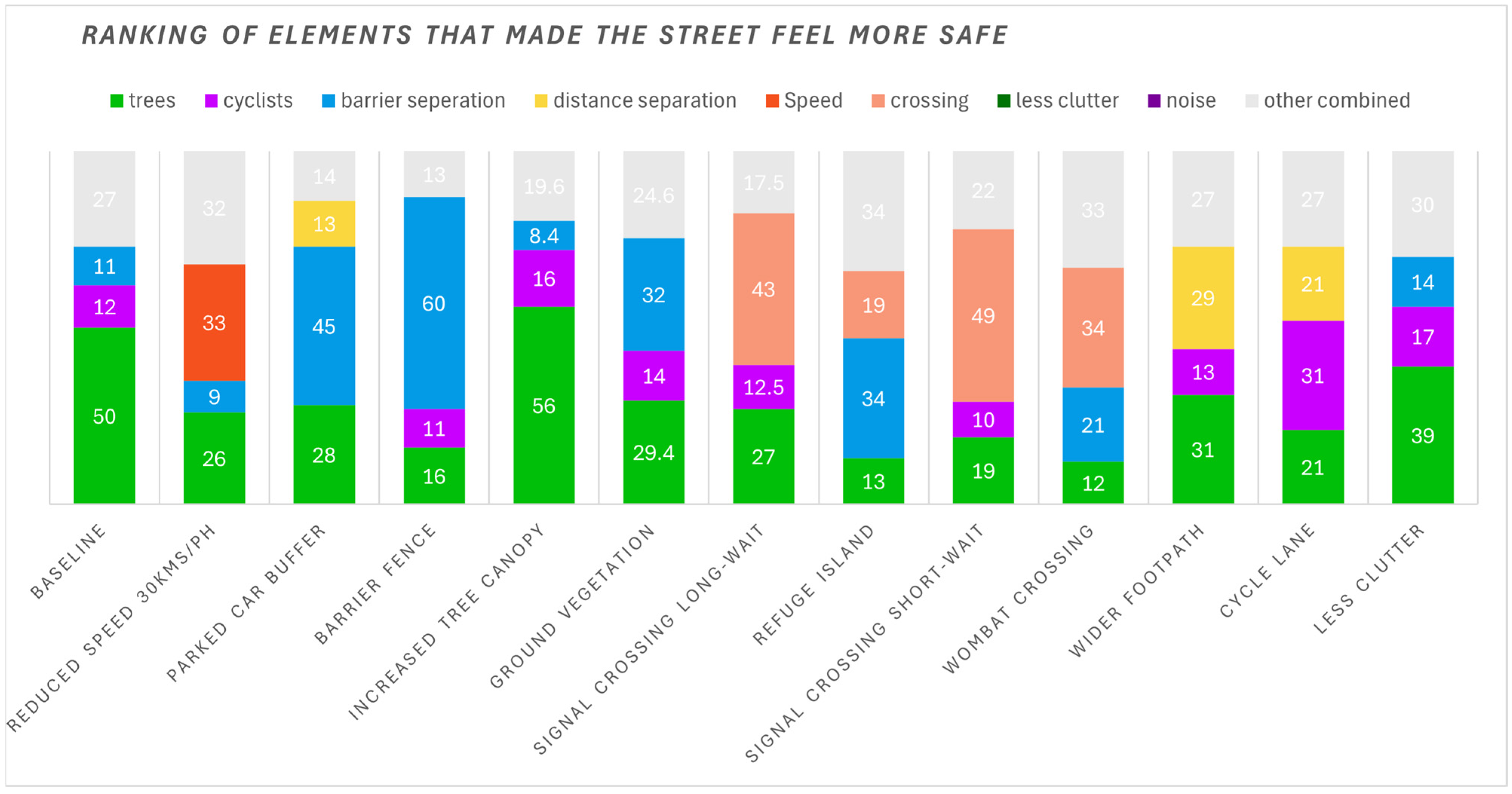 Across all scenarios, three elements were consistently ranked in the highest three as making a street feel more safe. These were trees, crossings, and separation from traffic. While trees still featured as one of the most highly ranked elements for improving perceptions of safety (ranked first in four scenarios), crossings and traffic separation were more consistently ranked first in response to this question (see
