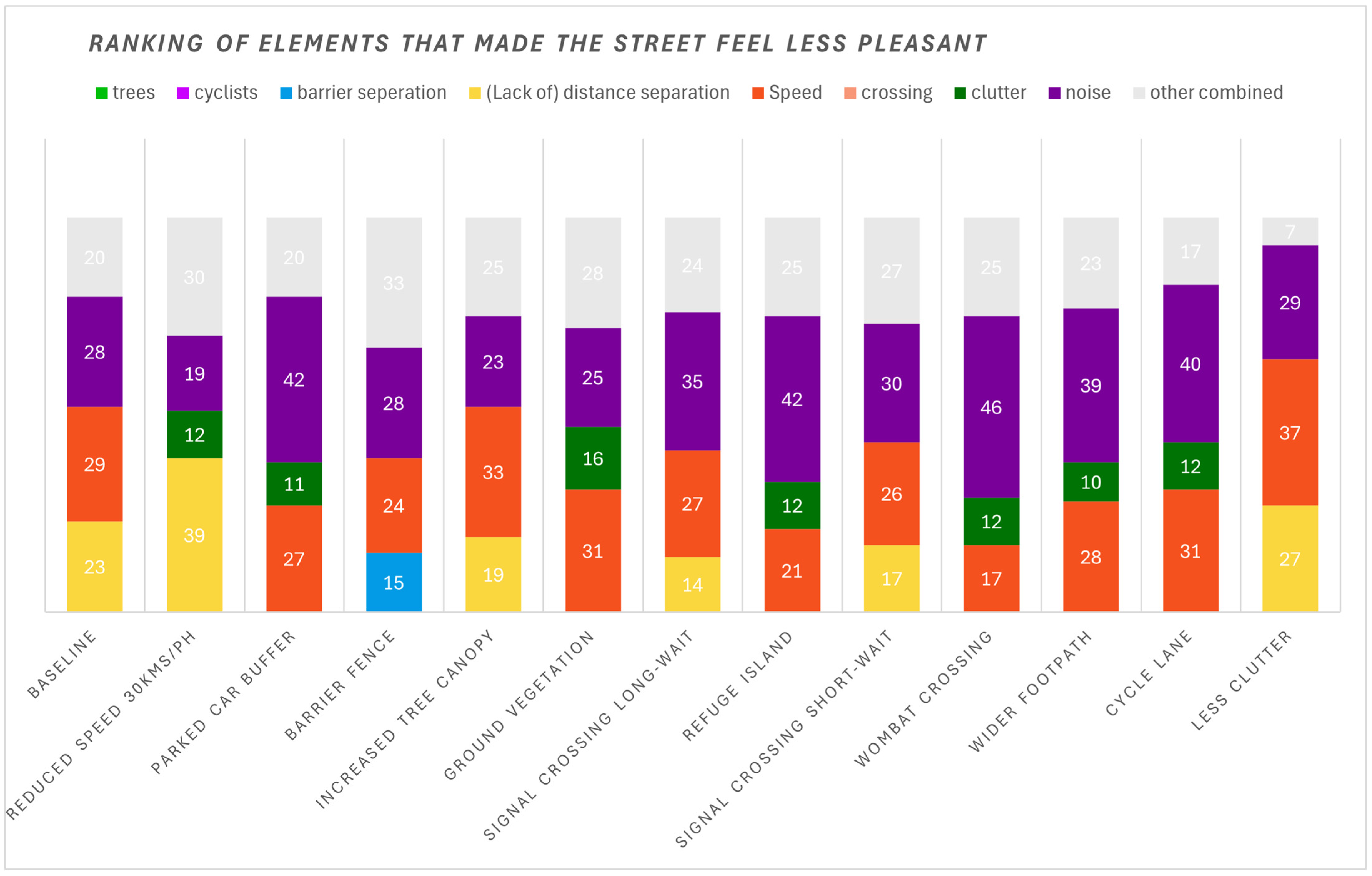 Analysis of respondent rankings across all scenarios identified the three elements most frequently selected as primary contributors to making a street less pleasant. The highest ranked factor was noise, followed by vehicle speed, and in third place a lack of distance separation from traffic. The presence of street clutter was also a commonly top-ranked element for reducing pleasantness. However, it is important to note that the inherent ambiguity of the term ‘clutter’ may have introduced a potential confounding effect. The word itself carries negative connotations, which may have influenced responses independently of the actual visual stimuli presented in the scenarios. Consequently, this particular result should be interpreted with caution.