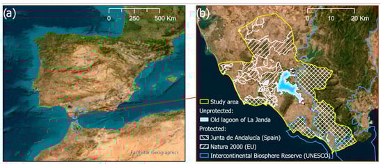 The cartographic sources utilized provided the delineation of protected natural areas designated as Special Areas of Conservation within the Natura 2000 Network (map 1b), in conjunction with the study concerning the restoration of the Janda lagoon and the adjacent wetlands, as published by Dueñas and Recio []. This study delineated the maximum floodable perimeter up to a height of 10 m above sea level.
