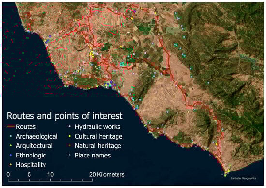 For the purpose of this study, the location coordinates of approximately one hundred sensitive sites were randomly modified with respect to the location available in IAPH website []. The presence of these entities within the designated territory should be regarded exclusively for the purpose of public education to take into account their contribution to the formation of the landscape. The access to most of this protected cultural heritage is strictly reserved.