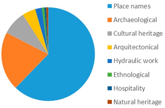 Within the municipalities encompassed by the study area, a total of 3791 toponyms were enumerated, which were subsequently categorized into nine distinct classifications (Table 2). It is noteworthy that the numerous duplicate elements in the toponym register and the 427 elements of cultural interest were previously examined.