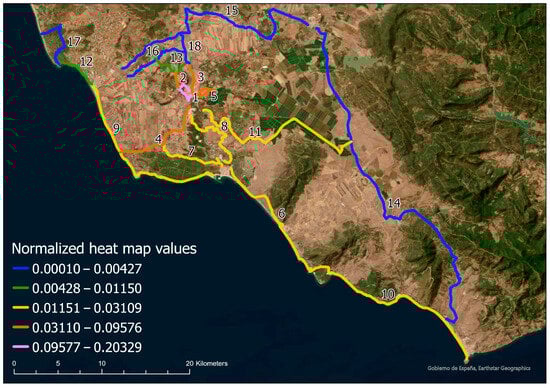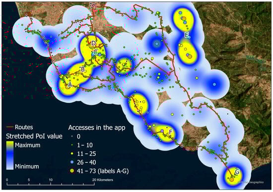 These techniques of social construction of the territory, grounded in public preferences and expressed though objective and transparent criteria, are consistent with the principles of Post-Normal Science: a science-policy interface that includes ethical considerations and equitable public participation in the generation of knowledge to ensure that it benefits all []. In this context, the use of GISs and PPGISs integrates local knowledge and preferences when building territorial narratives and brands. These tools enable stakeholders to identify emblematic sites and co-create meaningful experiences that reflect community values, thereby enhancing the authenticity and long-term sustainability of the routes. Ultimately, this approach seeks to build an interface between science and policy, capable of bridging the growing gap between expert-driven planning and citizen engagement.