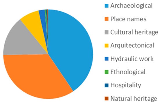 With regard to the toponyms referring to the transport network, it should be noted that, with the exception of roads, bridges, dykes and similar, there are 113 roads, 28 lanes, and 187 assets in the public domain of livestock trails: 50 cattle trails, 68 washes, 20 “padrones”, seven “cordeles”, and 42 “veredas” (Table 3).