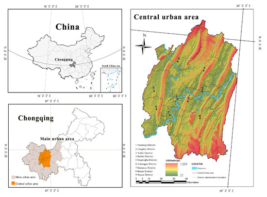 Located in southwest China, Chongqing (28°10′ N−32°13′ N, 105°17′ E−110°11′ E) is in the eastern Sichuan Basin and covers 4779 square kilometres in a folded parallel ridge-valley. The parallel ridge-valley, which consists of mountains with a continuous orientation and parallel boundaries, spans between 10 and 30 km in width. The alternately parallel mountains and valleys, steep mountain terrain, and elevations under 1000 m make it a distinctive mountainous landform [33] (Figure 1). Despite its proximity to the Yangtze and Jialing River basins, the city has few inland water bodies. Water features are few in high-density locations, while waterfront spaces are abundant in low-density areas. Natural limits have created a high-density urban development pattern that affects daily life. Chongqing City’s urban form is multi-centre and cluster-based due to nature and other causes. Each area can constitute a comparatively independent place with relatively complete regional amenities and production and living activities in this organic urban design. Thus, examining the inherent link between environmental elements in residential daily activity areas and inhabitants’ PD is crucial.