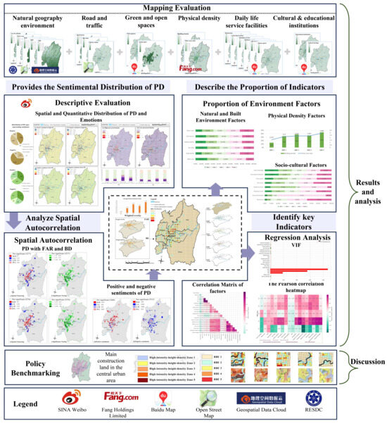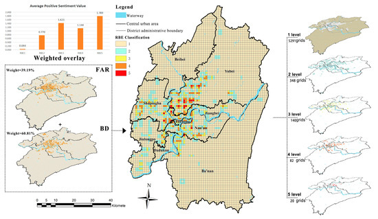 By analyzing user-generated content—such as comments and posts—researchers can uncover spatial and temporal patterns in collective sentiment, offering insights into public responses to environmental conditions and urban interventions. Despite its growing utility, several methodological challenges remain. One common issue is the misalignment between the geographic metadata of social media posts (e.g., from platforms like Weibo) and the actual locations described within the text, leading to spatial inaccuracies. Furthermore, sentiment classification models may fail to associate sentiments with specific environmental features or planning elements relevant to the study context. To address these challenges, keyword extraction using word segmentation systems can help identify text directly related to the research target, thereby narrowing the semantic scope and enhancing spatial specificity [31]. Advances in deep learning models have substantially improved the precision of sentiment classification. In contexts with limited annotated data, manual validation remains a viable approach to increase model reliability and ensure contextual accuracy. Additionally, statistical methods provide a structured foundation for preliminary analysis and large-scale data interpretation. Spatial grid-based clustering techniques further support the integration of environmental attributes, enabling categorical aggregation and distributional analysis [32]. These methods serve as the groundwork for more complex spatial modelling and inform evidence-based urban policy and management decisions. Understanding the determinants of PD across various high-density urban settings is vital for improving residents’ well-being and optimising urban environments. Although the Chongqing Land and Space Master Plan (2021–2035) outlines broad development guidelines for high-density areas, it lacks detailed strategies for the spatial allocation of service facilities. Therefore, it is essential to classify Chongqing’s RBEs and conduct PD analysis across multiple spatial scales to inform more targeted and responsive urban interventions.