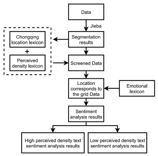 To identify texts containing perceptual density evaluations of specific locations, this study implemented a systematic text processing pipeline (Figure 3). Following Chinese language rules [39], English, numerical, and other irrelevant terms were then manually filtered out. Python’s Jieba tokenisation system was used to segment comment texts, followed by manual identification of 323 location-specific terms to construct a Chongqing location lexicon. Daniel & Stokols [40] distinguished between “crowding” and “density”, laying a foundational theoretical framework for PD research. He emphasised that the relationship between environmental density and subjective crowding is not linear, highlighting the critical role of psychological perception. Evans & Wener [41] explored the psychological mechanisms of perceived crowding in enclosed spaces, introducing key concepts such as “oppressiveness”, “loss of control”, and “stimulus overload”. Mouratidis & Kostas [42] examined the connection between PD and social emotions, analysing how high-density environments influence well-being and stress. However, there is still a lack of a systematically developed lexicon to describe PD. Guided by Stokols’ definition of PD, we categorised high PD into four dimensions: crowding, oppression, overcrowding, and compactness; and low PD into four corresponding dimensions: uncrowded, loose layout, sparseness, and a sense of openness. Based on this classification, we manually screened relevant keywords to construct a PD lexicon (Table 2).