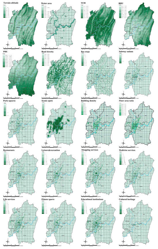 The indicator system considers mountainous cities’ natural and constructed environments, including topography and watersheds. The indicator system includes precipitation, temperature, and humidity indications for human thermal comfort. Built environment includes transport and green spaces. Physical density covers BD and FAR, while socio-cultural encompasses everyday life services and cultural and educational institutions (Table 5).