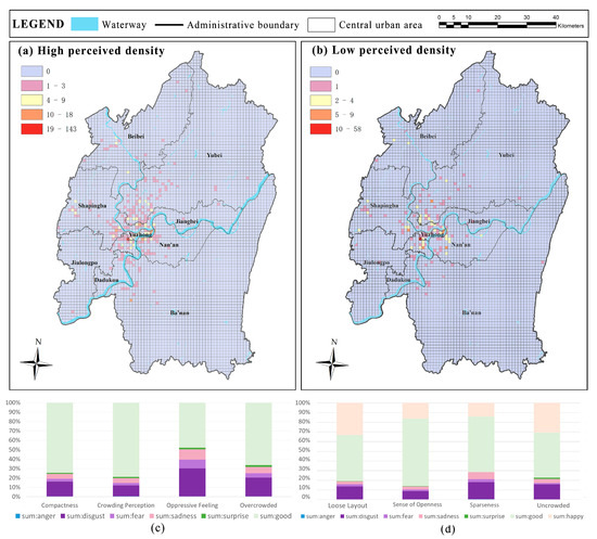 High PD areas (Figure 6a) were mainly concentrated in Yuzhong District and surrounding core urban areas such as Jiulongpo, Shapingba, Nan’an, and Jiangbei, forming a clear “central clustering” pattern. These hotspots (in red and orange) showed strong spatial aggregation, likely influenced by high population density, commercial activity, and the presence of landmark buildings. In contrast, low PD areas (Figure 6b), though also present in central districts, were less dense, with fewer and more scattered red zones, indicating a dispersed, non-central distribution. Figure 6c indicated a clear gradient in emotional structure under high PD. As the context shifted from “compactness” to “crowding–oppressiveness–overcrowding”, positive sentiments—particularly good ones—gradually declined, while negative sentiments increased. Among them, disgust and fear consistently dominated, sadness rose significantly in oppressive settings, and anger peaked under overcrowding. Overall, high-density contexts exhibited a negative pattern characterised by a “disgust/fear-dominated” structure. In contrast, low PD presented a stable “positive–low negative” configuration, with happy and positive states taking clear precedence and negative sentiments remaining minimal (Figure 6d). Only under “sparseness” does sadness show a slight increase, reflecting a sense of emptiness, but this did not alter the predominance of positive sentiments. Notably, “sense of openness” and “uncrowded” conditions yielded the highest proportions of positive sentiments.