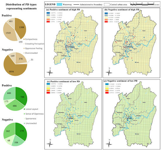 To more fairly represent the spatial distribution of sentiments in the study region and to further explore their numerical distribution characteristics instead of focussing on individual points, this study employed a 1 × 1 km grid to analyse the PD, combining the total area of unit sentiments with both positive and negative sentimental scores, as illustrated in Figure 4.